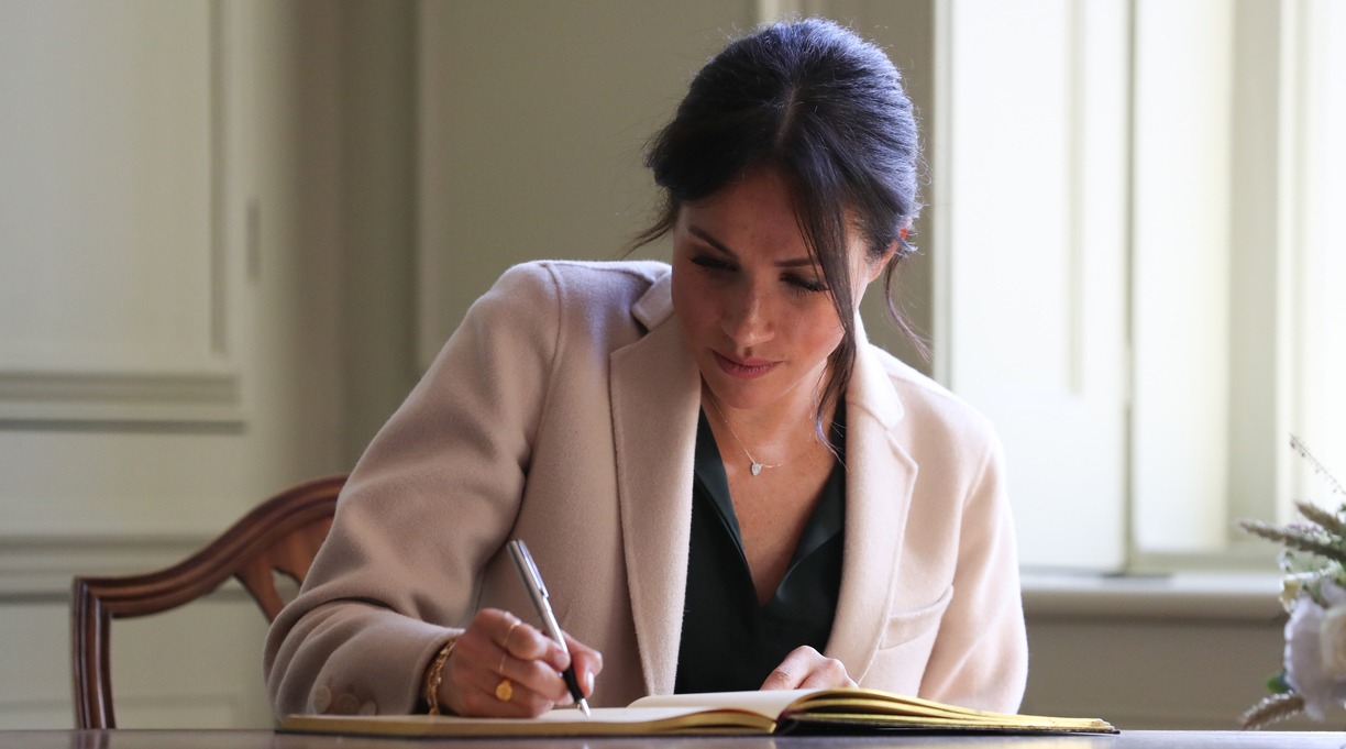 CHICHESTER, ENGLAND – OCTOBER 3: Meghan Duchess of Sussex signs the visitors book at Edes House during an official visit to Sussex on October 3, 2018 in Chichester, England. The Duke and Duchess married on May 19th 2018 in Windsor and were conferred The Duke & Duchess of Sussex by The Queen. (Photo by Daniel Leal-Olivas – WPA Pool/Getty Images)