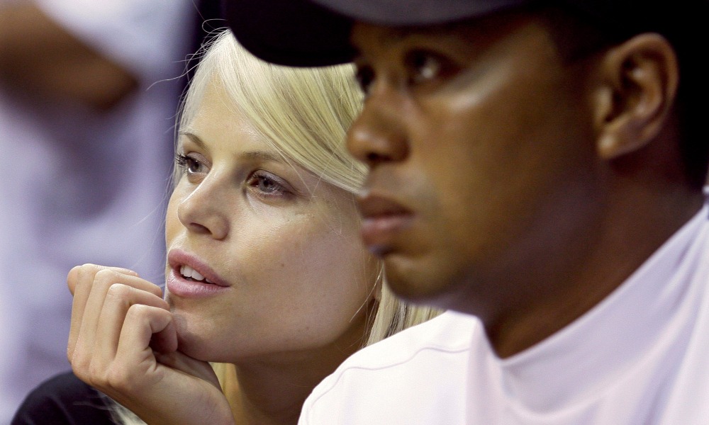 ORG XMIT: NY115 FILE – In this June 11, 2009 file photo, Elin Nordegren talks to her husband, golfer Tiger Woods during the first quarter of Game 4 of the NBA basketball finals in Orlando, Fla. Nordegren said she has “been through hell” since her husband’s infidelity surfaced but she never hit him, according to an interview released Wednesday telling People magazine she and Woods tried for months to reconcile the relationship. In the end, a marriage “without trust and love” wasn’t good for anyone, she said. (AP Photo/David J. Phillip, File)