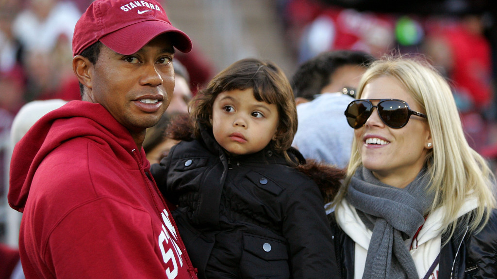 PALO ALTO, CA – NOVEMBER 21: Honorary Standford Cardinal captain Tiger Woods holds his daugher, Sam, and stands next to his wife, Elin Nordegren, on the sidelines before the Cardinal game against the California Bears at Stanford Stadium on November 21, 2009 in Palo Alto, California. (Photo by Ezra Shaw/Getty Images)